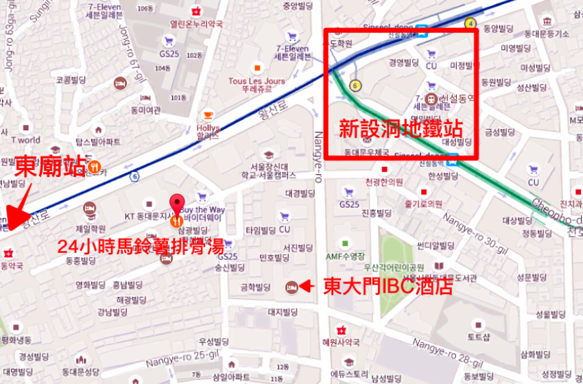 首爾東大門這間24小時馬鈴薯排骨湯,就在地鐵東廟站&新設洞站之間,從兩邊走路都大約5~10分鐘,藍色線沿路有機場巴士6002通過,交通方便。而且看地圖就知道一大堆便利商店,整體生活機能也很好,是來首爾滿不錯的住宿地點。