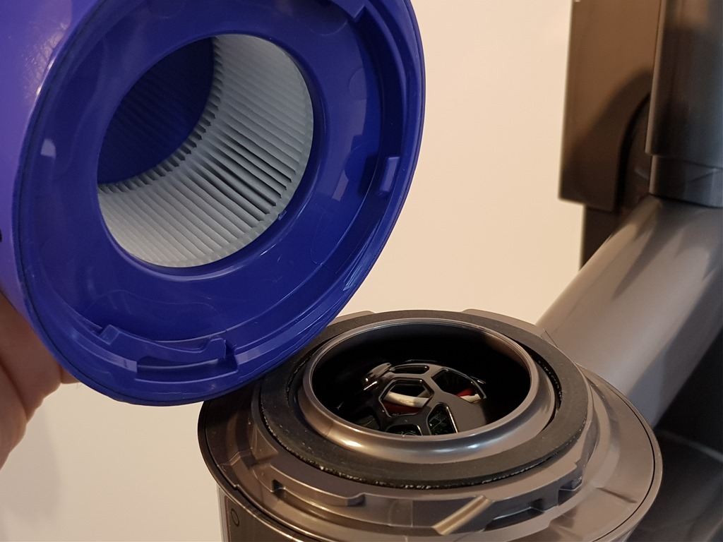 Dyson V8 carbon fibre 採用雙層放射式氣旋設計,共有 15 個上下緊密排列的圓錐氣旋同時運作,大幅增加氣流與離心力,可讓吸力更強、集塵力更大,也造就可將 0.3 微米塵螨、黴菌…等過敏原與污垢從空其中分離出來,並透過機身後的 HEPA 濾網,將過敏原停留在濾網上,排出乾淨的空氣,這樣的效果也獲得美國過敏協會認證。