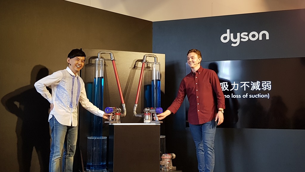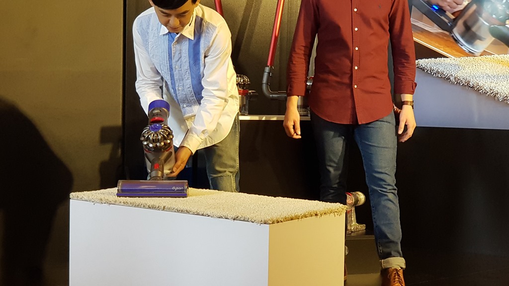 記者會現場,Dyson 工程師與黃子佼也親自示範 Dyson V8 carbon fibre 的各項特色,在各項地板的清潔上,只要輕鬆吸過,一次就能吸盡各式地面塵屑。