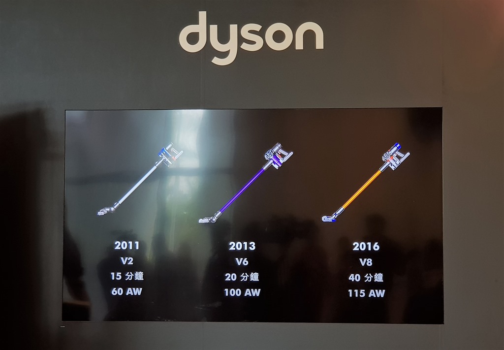 從 2011 年 V2 開始,設計出可使用 15 分鐘、60AW 吸力的手持吸塵器,之後開始年年進步,在 2013 年推出可使用 20 分鐘、吸力 100AW 的 V6 、2016 年推出可使用 40 分鐘、吸力 115 AW 的 V8,一直到今天在台推出的這款可使用 40 分鐘、吸力高達 155AW 的 Dyson V8 carbon fibre。