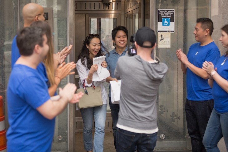 這是由美國 Improv Everywhere 節目所設計的一項內容,將透明的電梯放上白色的 Apple logo 儼然就像是 Apple Store 的風格,更請來演員偽裝成店員、排隊民眾以及記者配合演出,讓來來去去的人潮幾乎佇足觀看,也開始懷疑起是 iPhone X 的驚喜開賣! 即便有前往詢問的民眾,”員工” 還會很親切地回答他們因為數量有限,僅有排隊前 50 名的幸運兒才有。