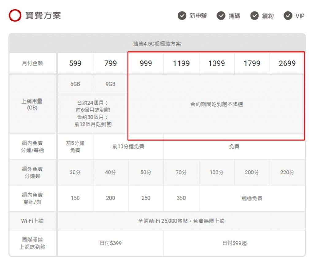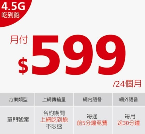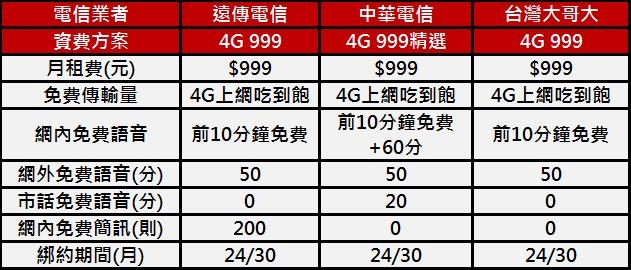 只要月付999元,合約期間4.5G極速飆網吃到飽不降速,網內語音前十分鐘免費、每月享網外免費50分鐘及250則免費網內簡訊。雖然電信三雄的999資費方案內容大同小異,但因遠傳電信4G基地台建設數量居電信三雄之冠,4G網速頗受好評,是目前最夯的4G上網吃到飽購機電信資費方案。