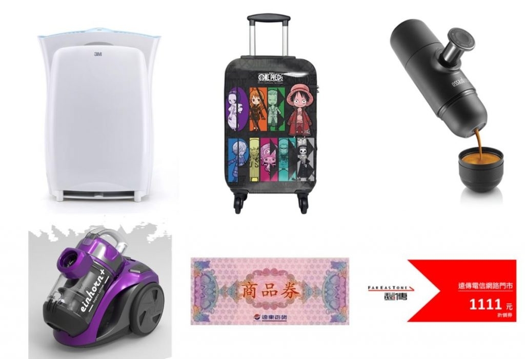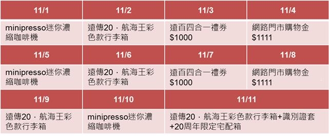 遠傳網路門市11/1~11/11天天祭出超值好禮,每日前11名新申辦/攜碼4.5G $999以上(含)方案且啟用成功之申請件,除了可享4.5G上網吃到飽及各項語音免費優惠外,還可額外獲得濃縮咖啡機、限量款航海王行李箱、遠百四合一禮券$1000元、網路門市購物金$1111元..等好禮總價超過25萬。( iPhone8/8 Plus及iPhoneX不適用此活動。)