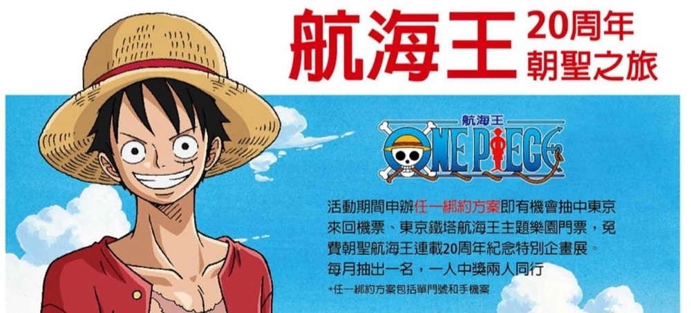 還有還有,「11.11活動期間」申辦任一方案都有機會抽到「遠傳.航海王歡慶20周年」兩人同行東京來回機票、東京鐵塔航海王主題樂園門票喔 !