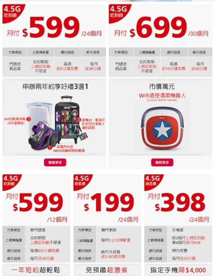 想要享受4.5G上網吃到飽飆速的人,可以自己綁約時間需求,選擇「$599飆網吃到飽(12個月)」、「$599飆網吃到飽(24個月)」+【3M空氣清淨機、美國奈米銀HEPA除蹣殺菌吸塵器、限量款航海王28吋行李箱】好禮三選一或是「$699飆網吃到飽(30個月)」+【美國隊長限定款 雲端遠控清潔機器人】。
