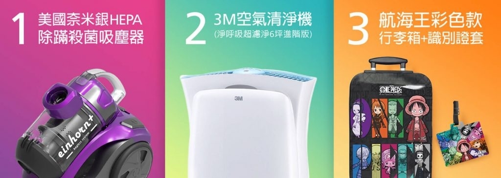 11/1~11/30於遠傳網路門市新申辦或攜碼「$599飆網吃到飽」(24個月),可享合約期間4.5G上網吃到飽不降速,網內前五分鐘免費、網外每月免費送30分鐘優惠,還可額外享有【3M空氣清淨機、美國奈米銀HEPA除蹣殺菌吸塵器、限量款航海王28吋行李箱】好禮三選一。
