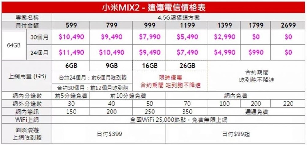 台灣米粉眾所期待的全面屏手機「小米 MIX 2」11月1日起也將在遠傳電信開賣,64GB版本售價各為 14,999 元,搭購999超極速專案價(30)為7,990元,1399(30)專案價為2,990元。雖然 「小米 MIX 2」目前僅支援遠傳電信2CA,不過搭載 S835 處理器/ 6GB 記憶體/5.99 吋 18:9全面屏/四曲面陶瓷機身, C/P值非常高,非常值得推薦入手。