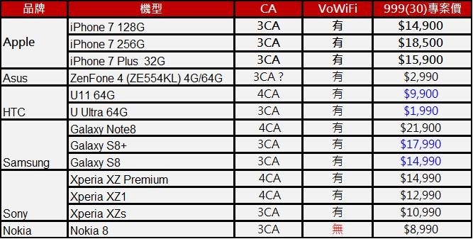 目前遠傳電信最夯的4.5G超極速$999吃到飽方案可以在遠傳網路門市搭購的3CA手機共有6個品牌13款機型,除Nokia 8外,其餘12款都支援遠傳VoWiFi功能,都是版主推薦應該優先選購的熱門手機。