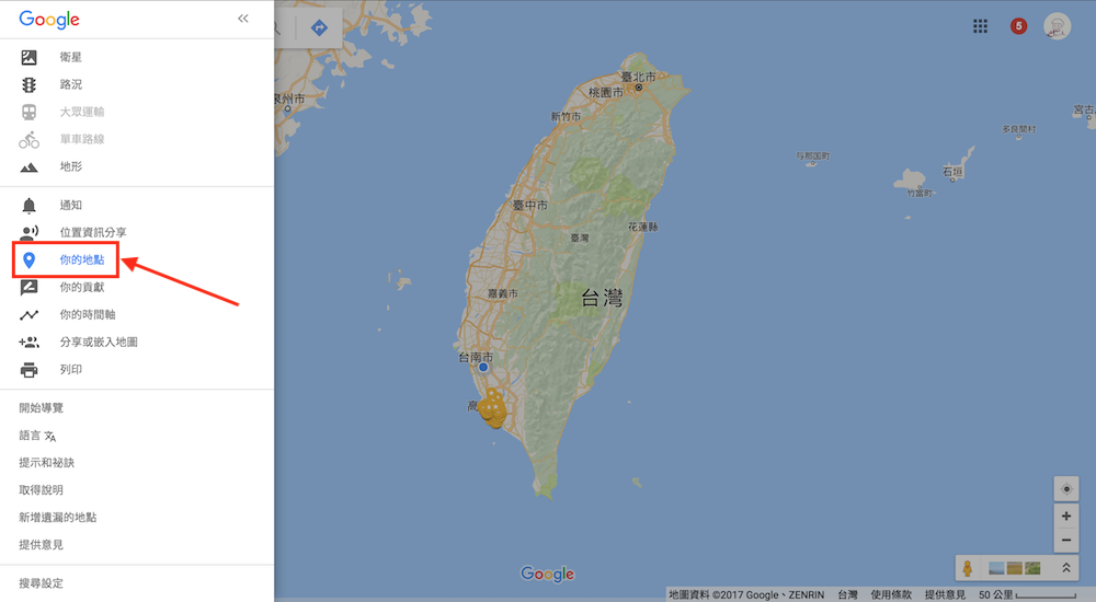 第一步 – 開啟 Google 地圖,並從選單中點選「你的地點」>「已儲存」