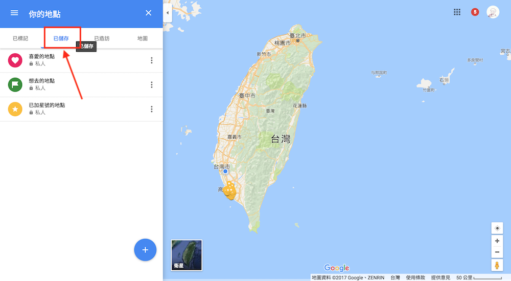 當開啟「你的地點」中的「已儲存」項目後,若要新增地點清單,則要點選資訊頁面中右下角的「+ 號」,這樣 Google 地圖才能開啟新增「地點清單」的功能。