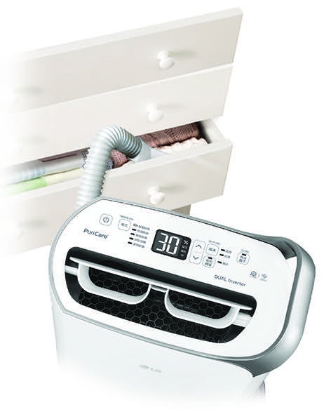 LG PuriCare 變頻除濕機結合空氣清淨功能,利用奈米離子淨化外部空氣,去除空氣中有害物質,並新增機體自動乾燥功能,能風乾機體內部,避免黴菌及臭味的產生,為消費者打造安全舒適乾爽的居家空間,除了有效減少室內濕度與淨化空氣的功能外,LG PuriCare 變頻除濕機還可以一機多用,提供衣物乾燥與烘鞋、烘衣櫥的功能,只要接上烘鞋 / 烘衣櫥專用配件就能局部集中除濕,且日除濕量提升至 16 及 17 公升、機體重量減輕至 17.7 公斤,讓消費者在使用上更為便捷。為了體貼平常的使用方式,LG 還把易拉式透明水桶容量升級成 5.3 公升,日除濕量最少可達 16 公升,而且輕鬆拿取的設計還能讓消費者在平時更為容易清潔。