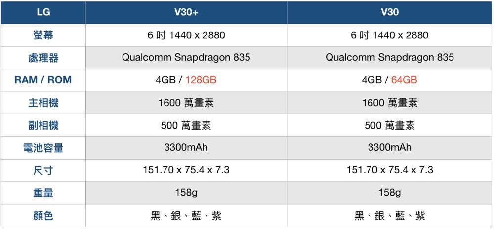 在 IFA 登場就受到許多朋友期待的 LG 下半年旗艦 V30+ 就在今天 (30 日) 總算登台。其實台灣發表的是 LG V30+ 在規格上僅有容量採用 128GB 與 V30 的 64GB ROM 有所不同,其餘也是採用高通 Snapdragon 835 處理器、4GB RAM、搭載 Android 7.1.2、3,300mAh 電池容量,IP68 防塵防水、無線充電、臉部辨識等,即便顏色也是同樣有著黑、銀、藍與紫四色。
