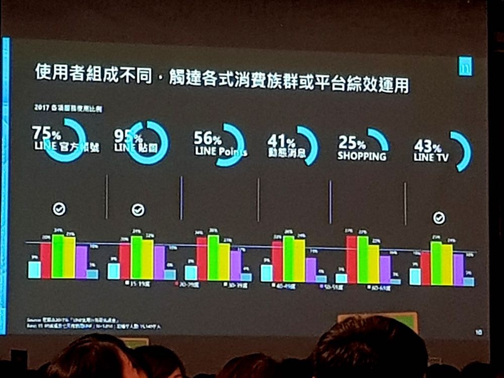 LINE 各項服務的使用狀況方面,免費貼圖為 95%、官方帳號為 75%、LINE Points 56%、動態消息 41%、Shopping 25% 與 LINE TV 43%。近六成 LINE 用戶天天看 LINE TODAY,主力族群為 30-49 歲,LINE TODAY 用戶一天開啟 LINE TODAY 3.9 次,平均每次使用時間為 5.5 分鐘。在使用動態消息的用戶中,在動態消息上會了解親友近況,也會搜尋與瀏覽好康 (76%) 和購物資訊 (52%),每天使用動態消息者約佔三成。