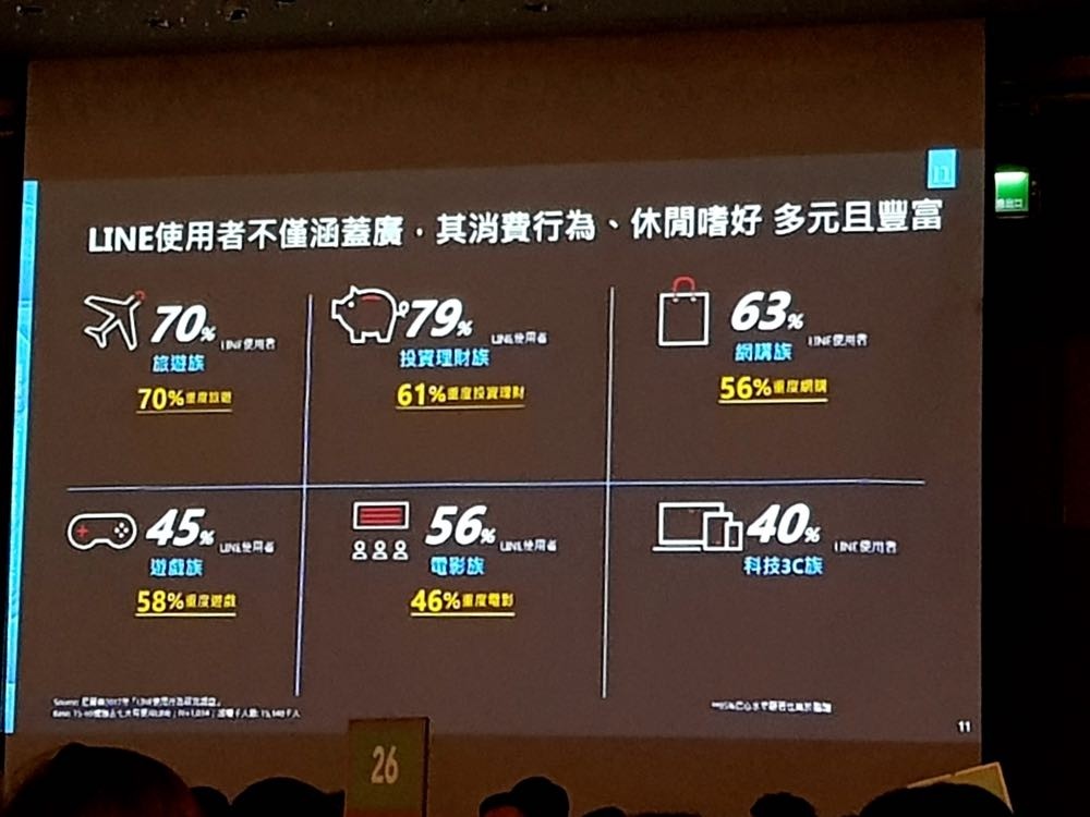 LINE 用戶消費行為與休閒嗜好多元且豐富,70% 為旅遊族、79% 為投資理財族、63% 為網購族、45% 為遊戲族,56% 為電影族,40% 為科技3C族。在LINE 最常從事的行為,主要有傳訊通話 (96%)、工作討論 (53%)、閱讀新聞 (39%,較去年成長 7%),關心朋友最新動態 (38%),累積 LINE Points (30%) 與觀看短片 (27%),和獲取商品訊息或優惠通知 (25%),呈現使用者透過 LINE 進行各式訊息交流,包含閱讀新聞與世界接軌。