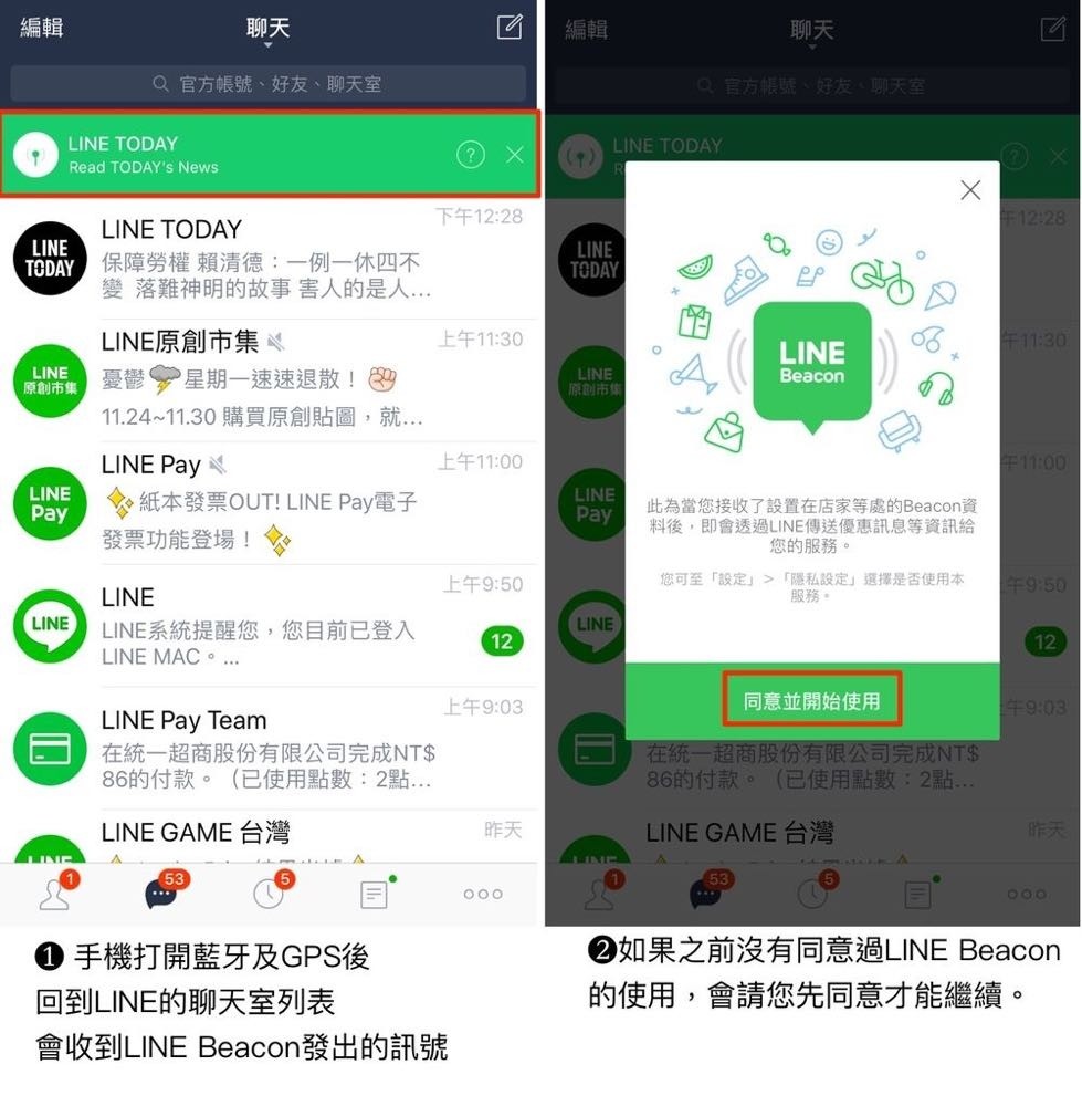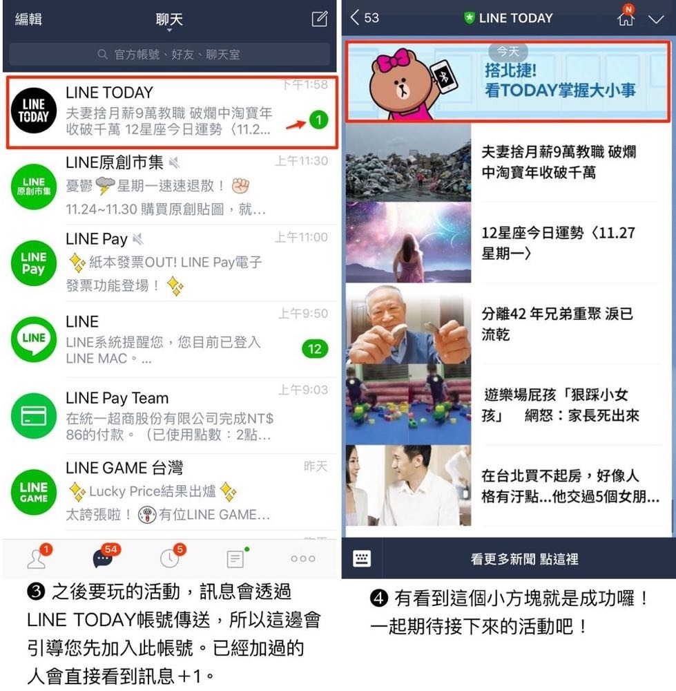 找到後將手機打開藍牙與 GPS >>> 回到 LINE 聊天室列表中,同意 LINE Beacon 的活動 >>> 加入 LINE TODAY 帳號 >>> 進去 LINE TODAY 上方看見「搭北捷!看 TODAY 掌握大小事」的熊美圖框後就算加入完成!