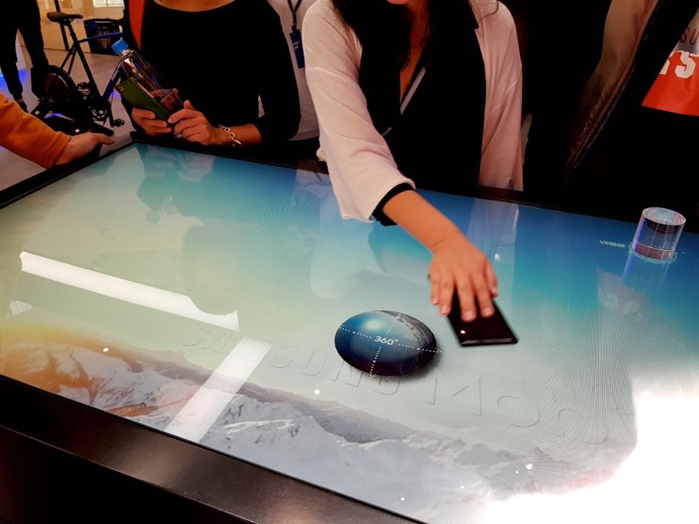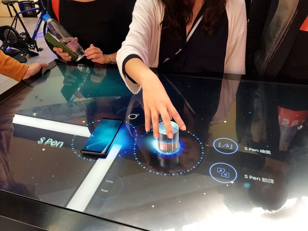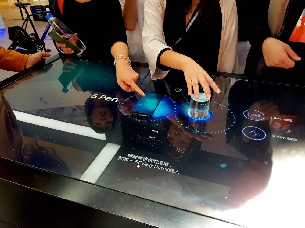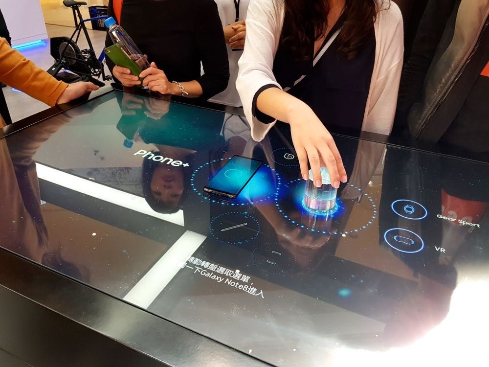 「探索 Galaxy」– 透過手機來結合互動桌,只要依照指示來移動手機、旋轉壓克力按鈕,就能選擇想要瞭解相關的功能並且透過互動的方式有最深度的體驗感受。
