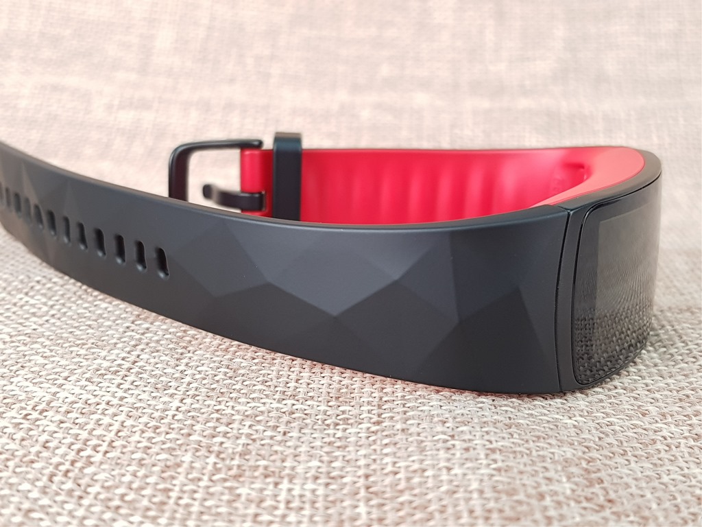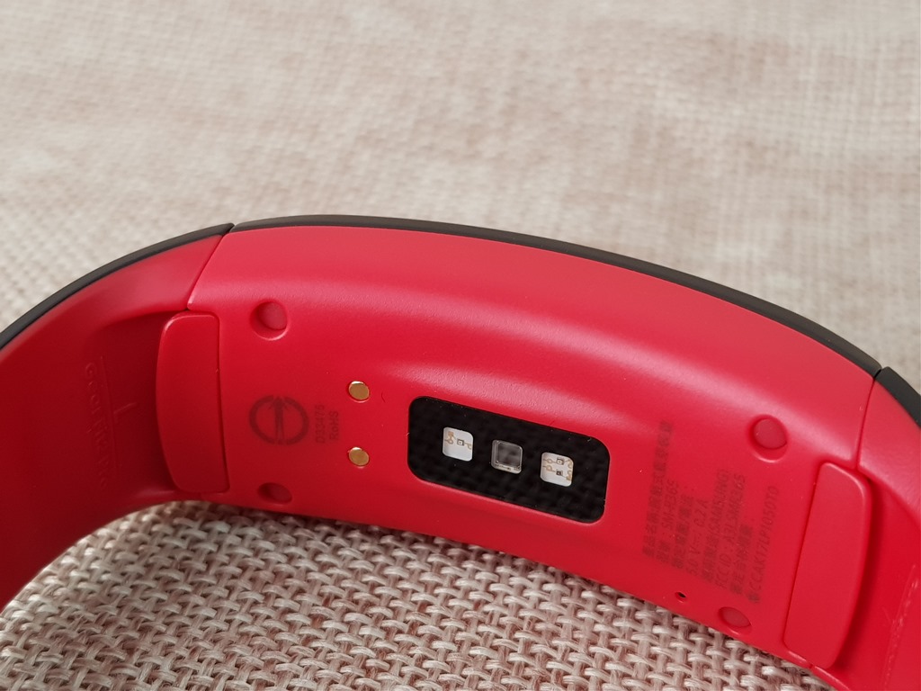 手環外觀是以圓弧設計,更貼近手腕弧度,搭配有彈性的錶帶,在運動時可更緊密卻更無壓力的配戴,也讓偵測更為準確。錶帶有兩種設計,手上這款紅色版本是搭配立體菱格設計的錶帶,黑色版本則是流線圖型錶帶,我個人比較喜愛紅色版本。