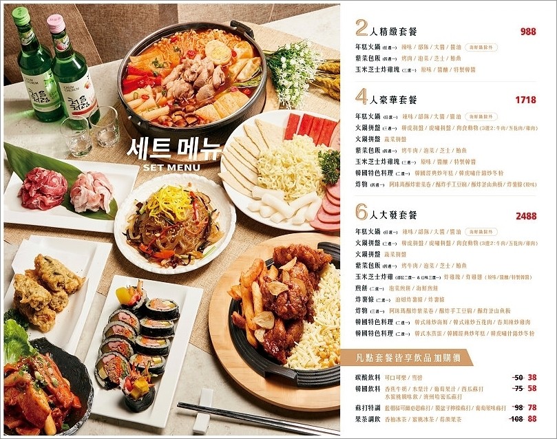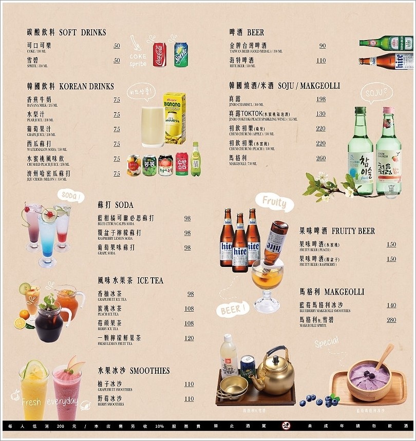 ▼飲品選擇也不少,有碳酸飲料、韓國飲料、蘇打、水果茶、冰沙、啤酒、韓國燒酒/米酒、果味啤酒、馬格利等,都可以視個人喜愛搭配享用!(未滿十八歲請勿飲酒)