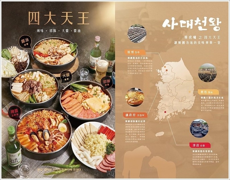 ▼登愣!這裡主打的就是四大天王的韓式火鍋啦!有醬油、大醬、部隊、辣醬等四種不同湯頭,一次就能網羅到韓國各地的不同美味!