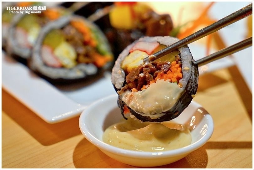 ▼白飯裡頭包裹著烤牛肉、蟳味棒、小黃瓜、玉子燒、紅蘿蔔等配料,一口吃下口感清爽順口,帶點烤牛肉及配料的微微香甜,沾附特製花生芥末醬更為提味好吃!
