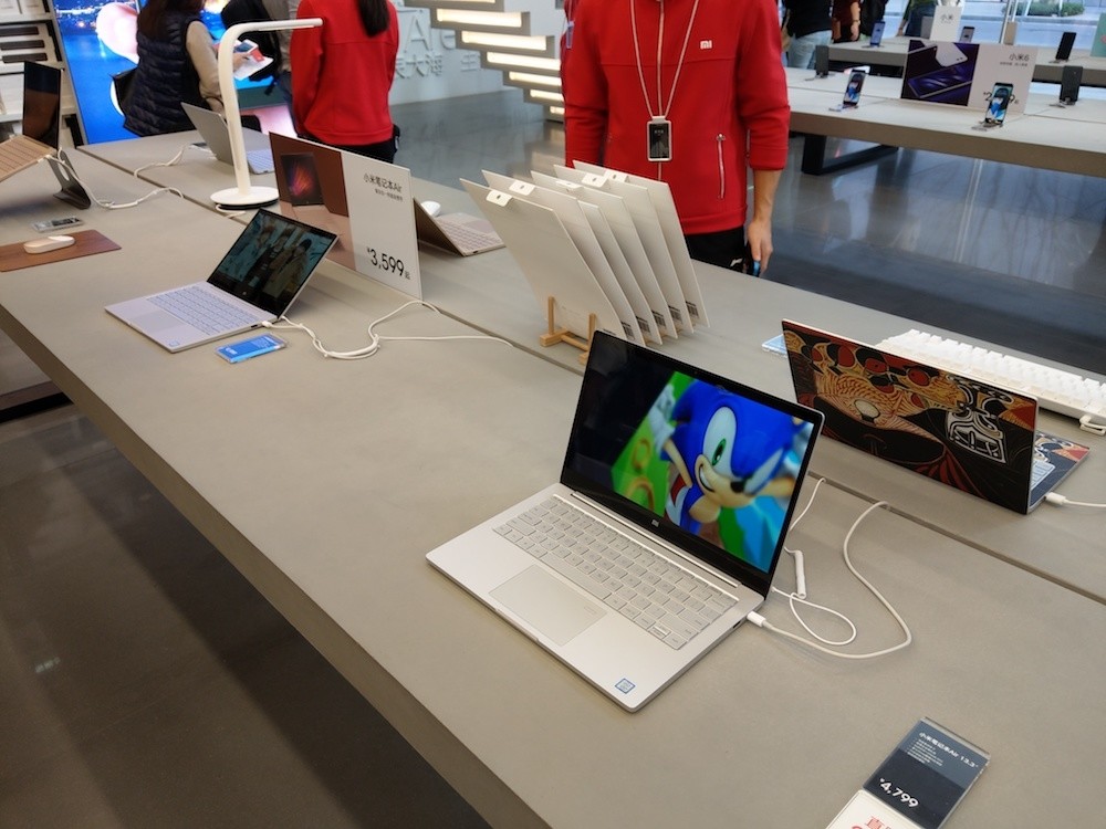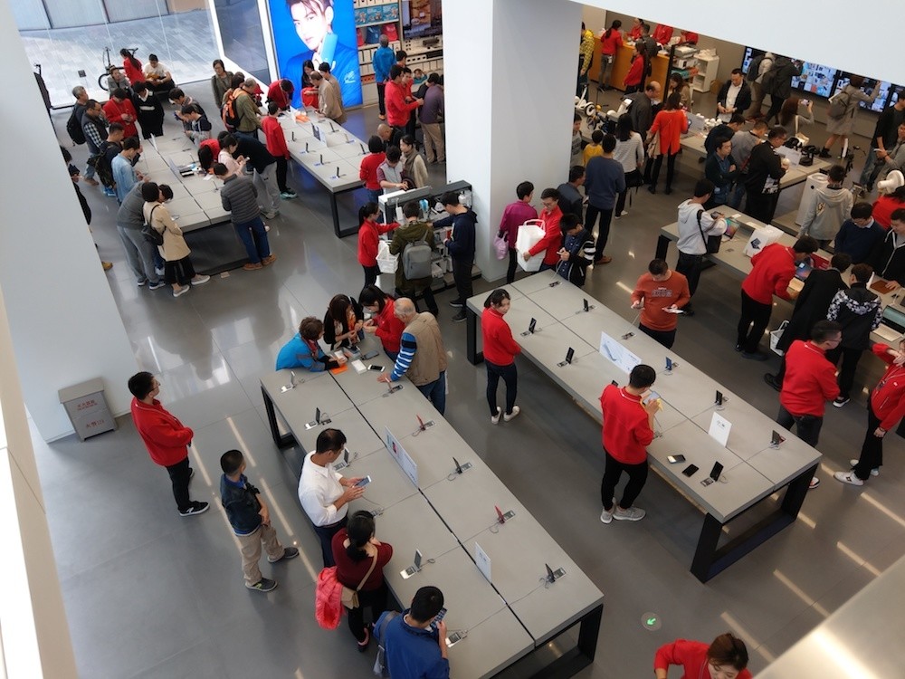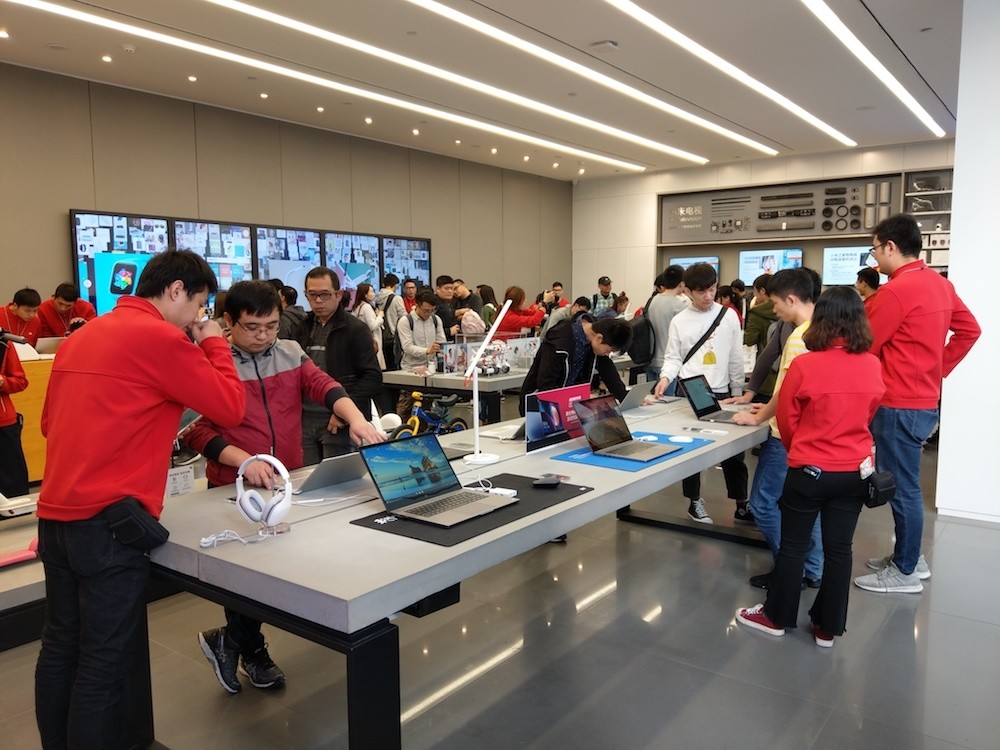 在小米之家深圳旗艦店的一樓中,除了展示小米個系列手機產品之外,現場還另有展示小米筆記型電腦、耳機、路由器、行動電源、排插、空氣清淨機、小米電扇、米家行車記錄器…等產品。消費者可到各個展示櫃位體驗、試用,滿意後可隨時向站在周圍的小米之家員工,刷卡購買以及領取現貨。