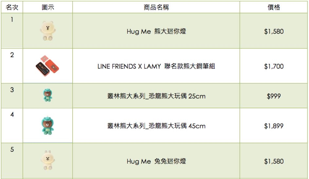 快抱我!年度最佳人氣話題商品「 HUG ME 迷你燈」不負眾望,由熊大迷你燈榮登 LINE FRIENDS 2017 十大暢銷商品榜冠軍,兔兔迷你燈也拿下第五名!「HUG ME 迷你燈」於 7 月 5 日上市,上市兩週就迅速造成全台缺貨!「叢林熊大」自 4 月起推出系列商品,從療癒系絨毛玩偶、到兒童餐盤到兒童背包等,近 20 項種類,一口氣拿下四席,12 月中更將推出兒童服飾與立體玩偶背包,預計再掀叢林熊大熱潮!