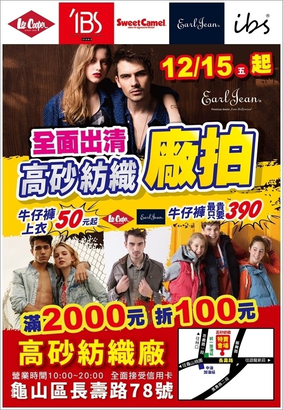 大口最愛、最期待的高砂紡織廠拍又來啦!位於桃園市龜山區長壽路上的高砂紡織廠拍,裡頭包含IBS、Earl Jean、Lee Cooper、Sweet Camel等知名品牌聯合特賣,不但材質好、版型佳、設計美,重點是超殺50元起跳,而且重點是買2送1,讓你進來後就很難再走出去啊!如果時間有限的朋友大口建議先往50元必殺區&100元必買上衣、褲子區,且通通買2再送1,不買可惜!此外還有必敗190外套區、290元衣褲區、390元必買牛仔褲區進攻,不僅價格超實惠而且還能享受挖寶的樂趣!羽絨外套更是直接下殺400~800元不等,不管是買來自用或送人都值得!另外還有美式機能專區,不管是要運動、登山或休閒都非常適合,價位從150元起跳,買到賺到!重點是消費滿2000元現折100元,還可以以此類推,買越多折越多,這麼佛心的價格特地來都划算,一定要來撿便宜啊!大口已經幫大家整理好交通資訊與搶購攻略,希望提供給想挖寶、搶便宜的朋友一些幫助!