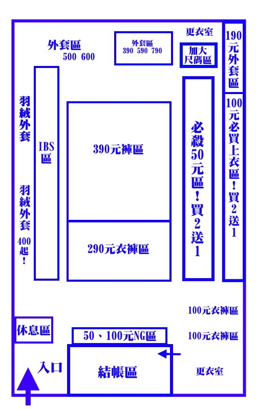 ▼依照慣例大口先把地圖畫給大家看,如果沒有時間久逛的朋友大口建議一來就可以直衝這幾個區塊!像是必殺50元區就是撿好貨、賺樂趣的好地方,根本就是買1件賺4件,有搶到喜歡的真的可以算是運氣超好的,重點是今年還增加買2送1的活動,也就是三件只要100元,喜愛的朋友必搶!另外必敗的就是100元必買上衣區,這一區也是買2送1,根本就是C/P值爆表的必敗專區!有時間的朋友還可以逛逛190元外套區、290~390元的衣褲區,還有超暖和的羽絨外套及機能專區,價錢遠比外頭專櫃便宜許多,真的要趁這次機會好好選購!