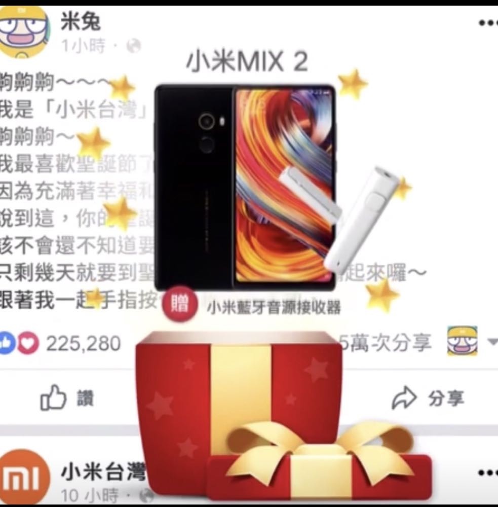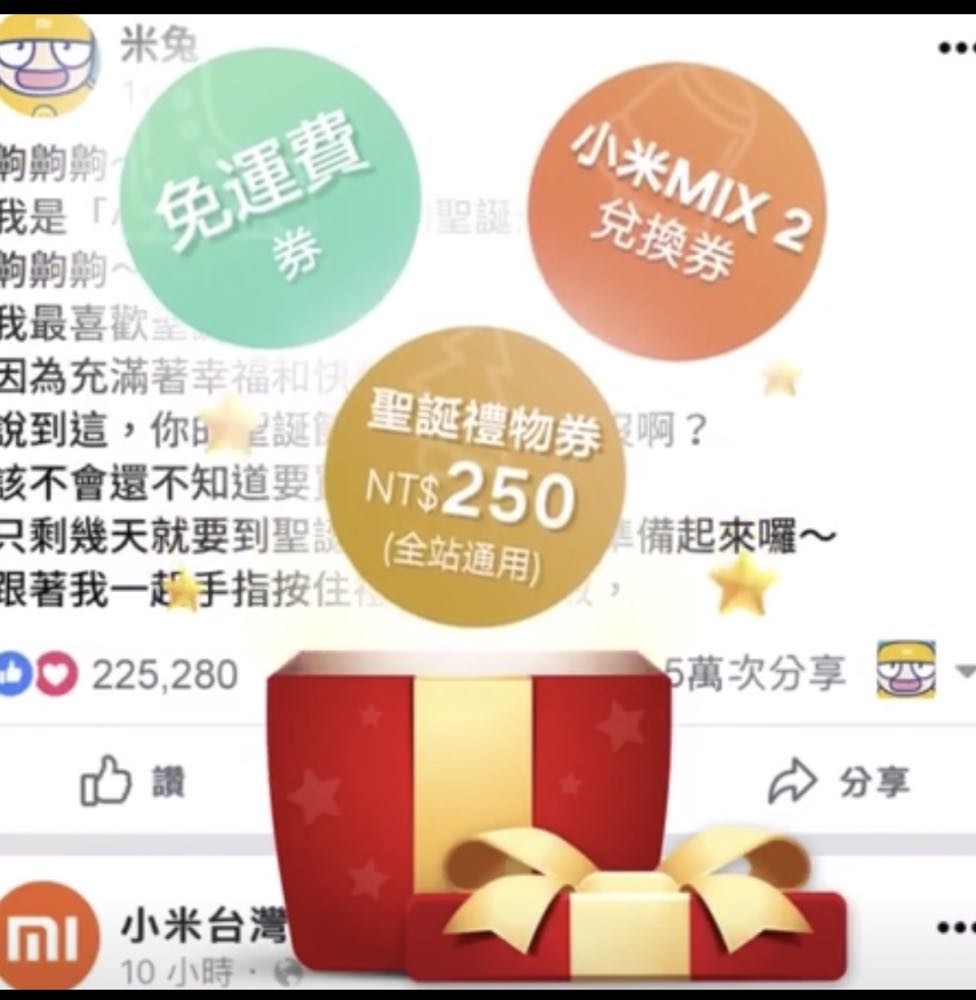 除了新品的期待,小米官方粉絲團也為大家帶來小米 MIX2 贈送藍牙音源接受器、米家掃地機器人送虛擬牆、免運費券、小米 MIX2 兌換券與聖誕禮物兌換券 NT$250 等驚喜好禮,不過要注意的是大家要記得是用手機來長按住禮物盒上的盒子後開啟禮物唷!