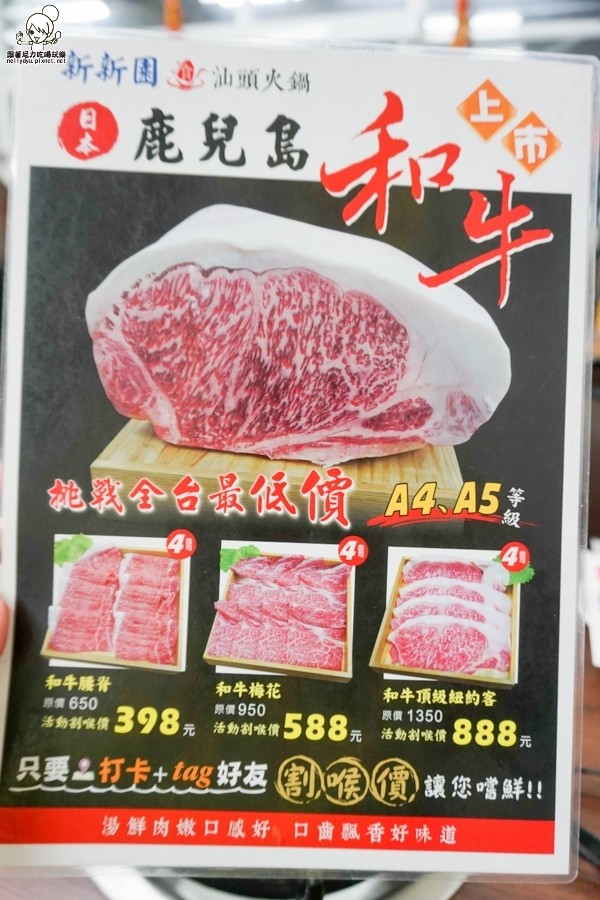 新新園汕頭火鍋有五大天王招牌必點:美國Cab級霜降安格斯、骰子牛、日本和牛腰脊、日本和牛梅花及和牛頂級紐約克