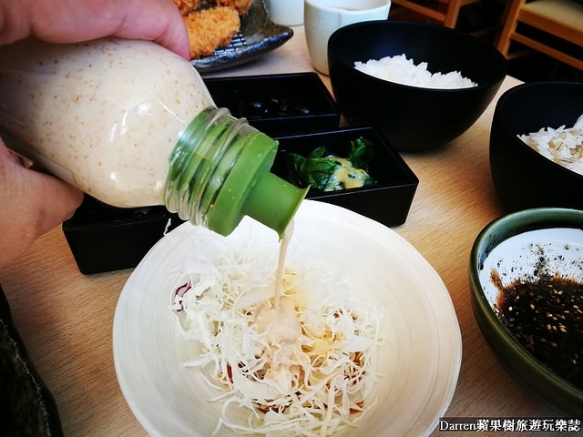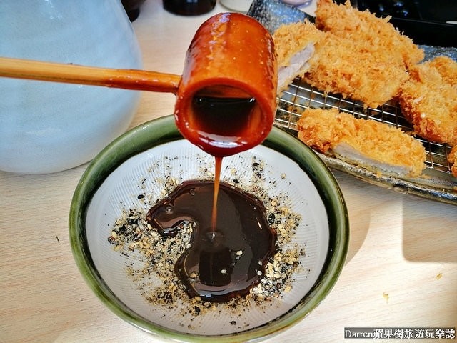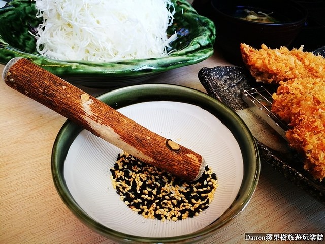 芝麻可以用磨棒畫圓畫圈的方式磨細,再淋上桌面上的豬排醬,加入了芝麻香氣的豬排醬沾什麼都還不錯唷