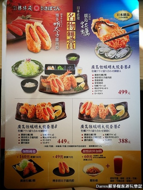新宿勝博殿日式豬排就在jc park桃園春日館二樓,店門口就放著這次新品廣島牡蠣明太子餃套餐的介紹