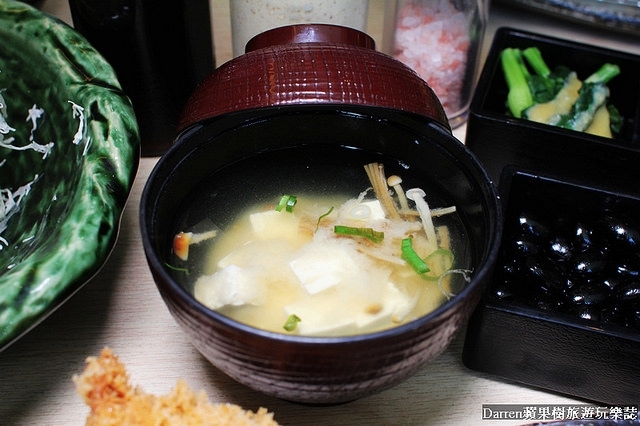 搭配附餐米飯、味噌湯以及前菜的黑豆、白蘿蔔和芥藍菜等小菜,整個套餐份量蠻多的,一個人吃很有飽足感