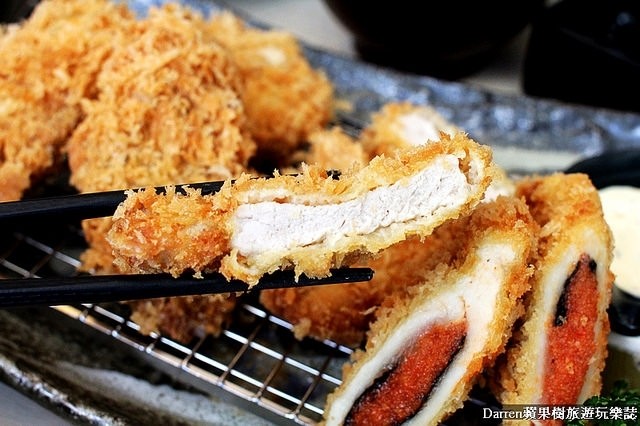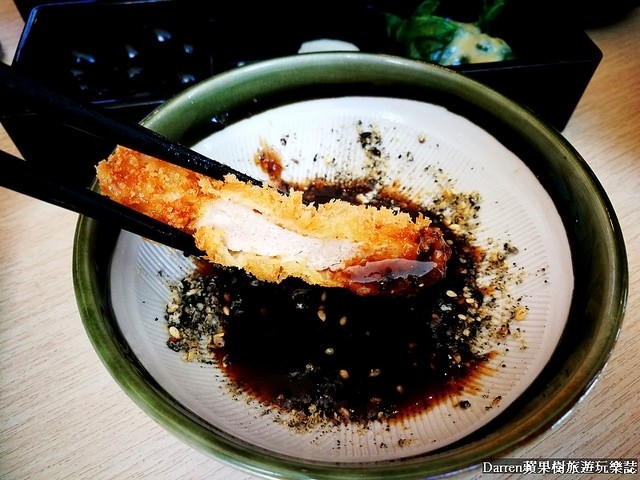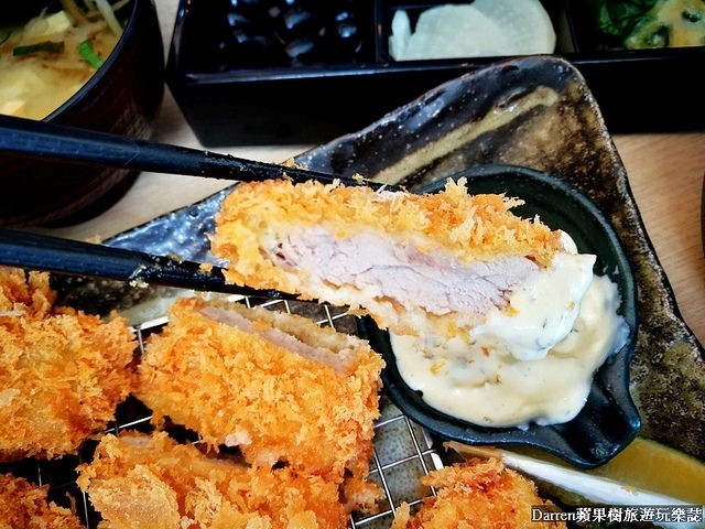 里脊豬排的肉質油花豐富,吃起來細緻比較有嚼勁,他們家的麵衣真得很酥,可以搭配豬排醬增添甜香醇厚滋味