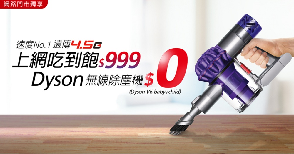 辦999元方案,且於2018/1/10前啟用成功之申請件,可獲得Dyson V6 baby+child無線除塵機