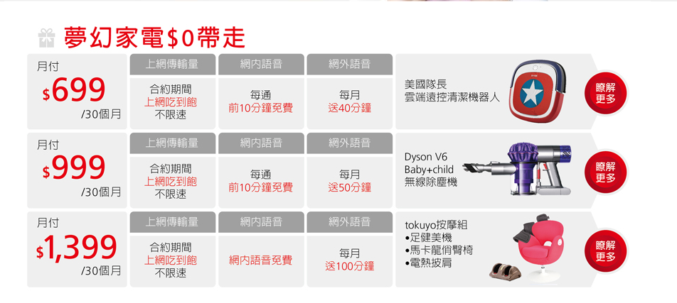 目前共有三種方案,分別是月付699元/999元/1399元,每一種方案都是上網吃到飽(不限速)