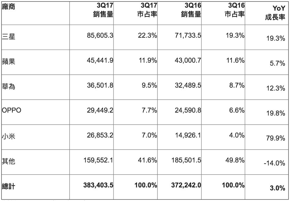 就在稍早國際研究暨顧問機構 Gartner 公布了 2017 年第三季全球智慧型手機的銷售量等資訊,總計 3.83 億支的銷量較去年同期成長了 3%,而前五大智慧型手機除了蘋果 (Apple)增加 5.7% 之外,皆擁有兩位數的成長!