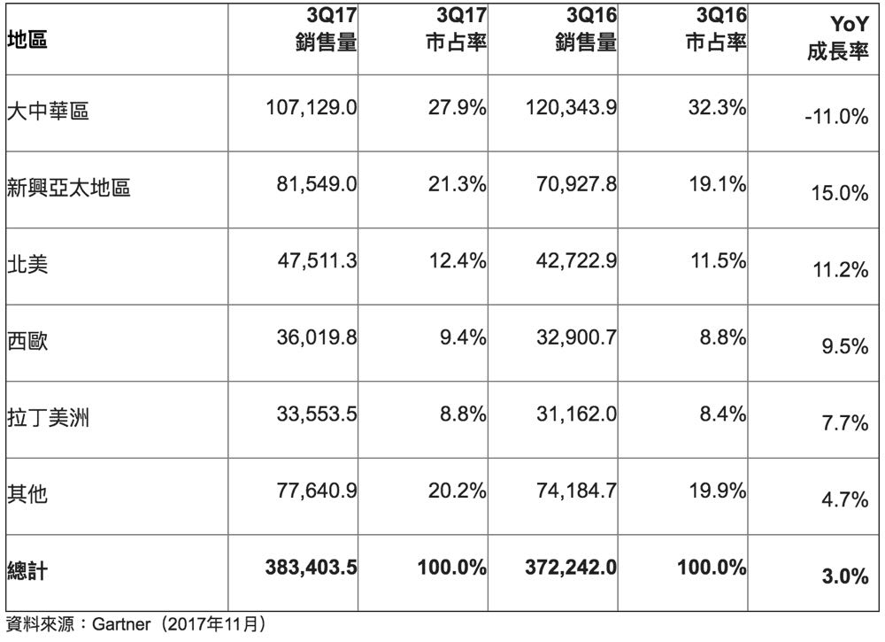 除了銷售數字,Gartner 還提供了全球各地區的銷售分部表格。