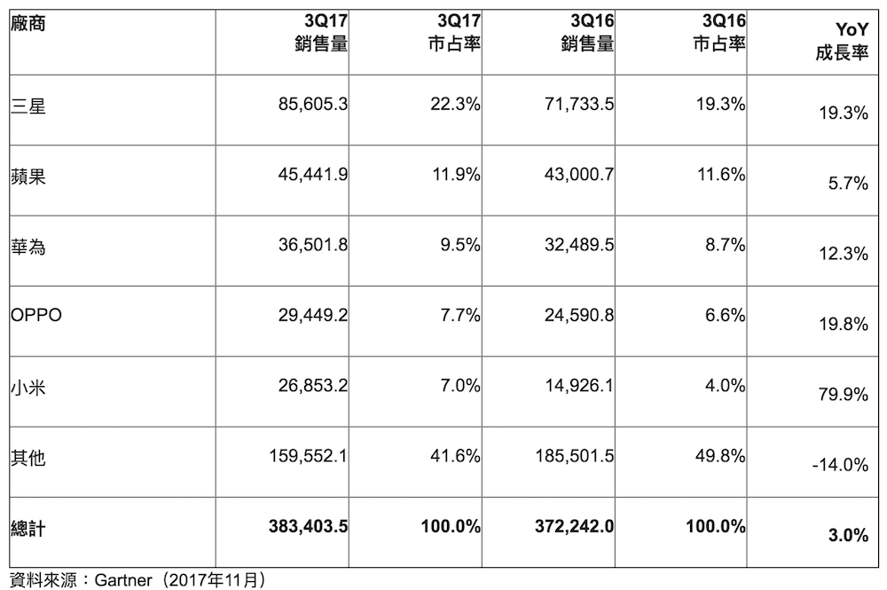 國際研究暨顧問機構 Gartner 表示,2017 年第三季全球智慧型手機對終端使用者銷售量 (以下簡稱智慧型手機銷售量) 總計 3.83 億支,較去年同期成長 3%。前五大智慧型手機廠商當中,除蘋果 (Apple) 增加 5.7% 外,其餘品牌均達到兩位數成長,而 Gartner 研究總監 Anshul Gupta 也預估,隨著蘋果旗艦機上市,以及各商家推出的優惠活動,2017 年全年智慧型手機銷售將達到 15.7 億支。