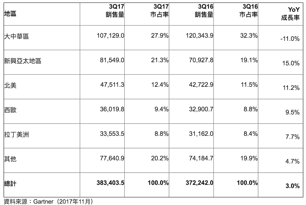 若以全球各大區域市場來看,大中華地區在第三季整體銷售下滑了 11% (見下表),原因是部分本土及知名度較低的品牌開始整併,再加上消費者偏好知名度高的高價智慧型手機,這也瓜分了本土品牌低價智慧型手機的需求。而在西歐及北美地區,市場對大品牌頂級智慧型手機的需求相對較高,也帶動了第三季智慧型手機銷售上揚。此外,從下表中也可以看到,新興亞太地區的成長率是各地區中最高的,也間接顯示了新興亞太地區的需求逐漸上升,可望成為智慧型裝置的新興市場。