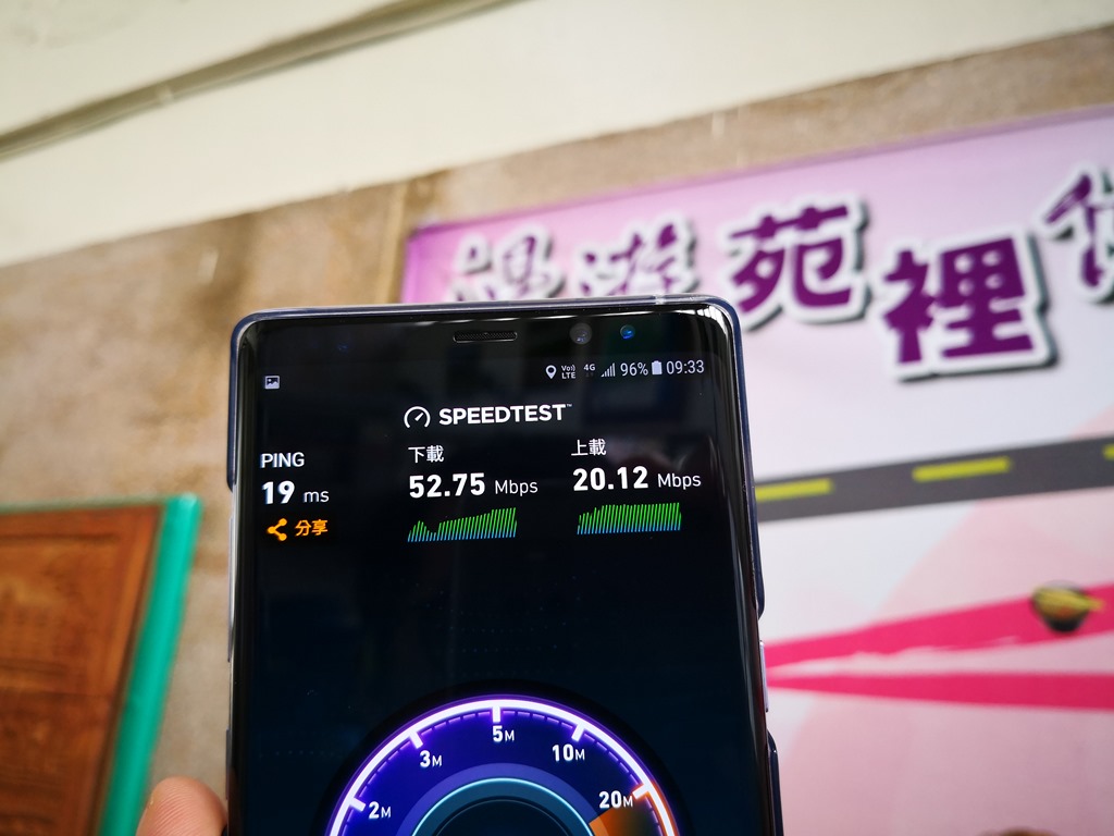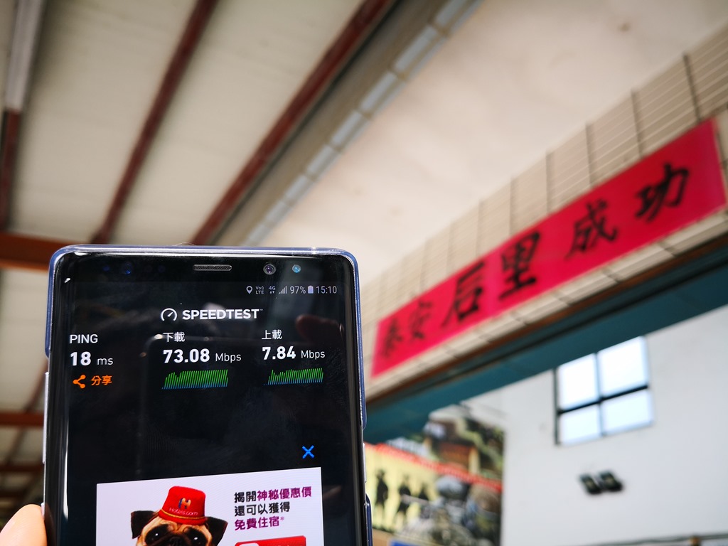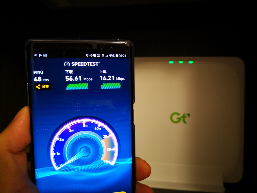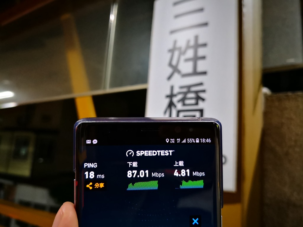 就在 12/14 早上 6:30 從家中出發到三姓橋,開始這一整天的測速,出發前在家中先測了一下速度,下載 56.61Mbps、上傳 16.21Mbps,跟來安裝時差異不大,用來測試的手機款式為 Samsung Note8,測試軟體為 SPEEDTEST。