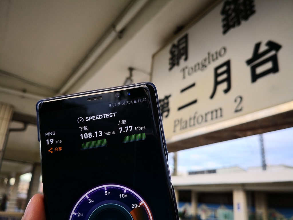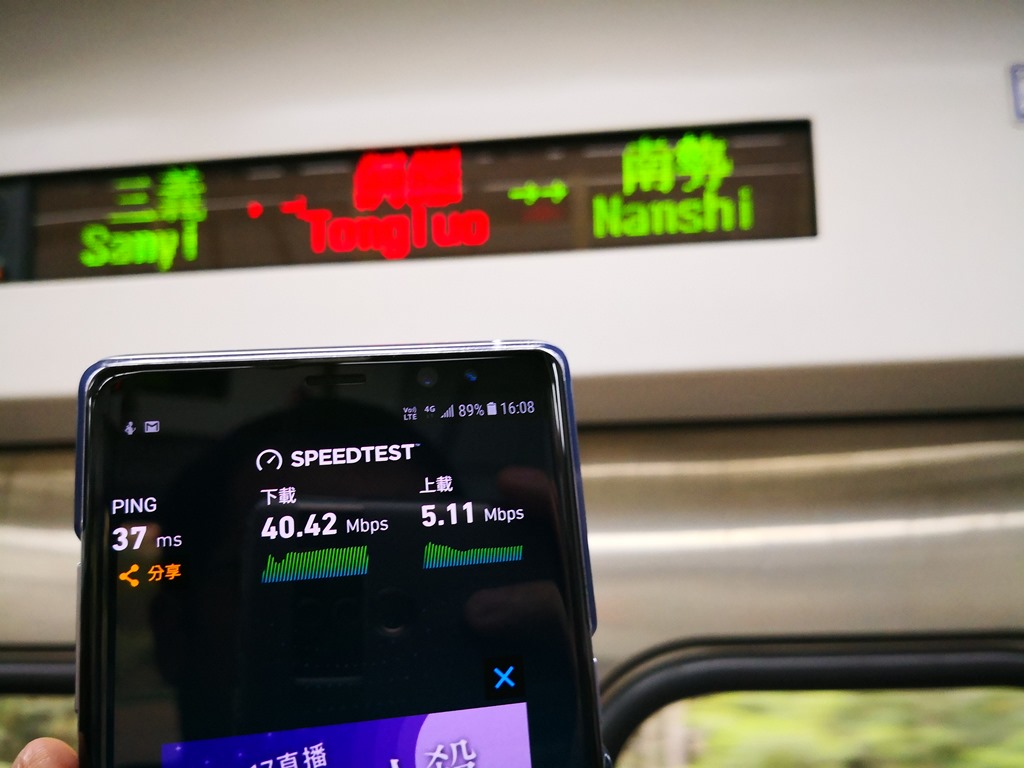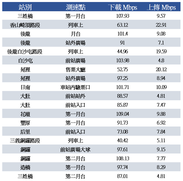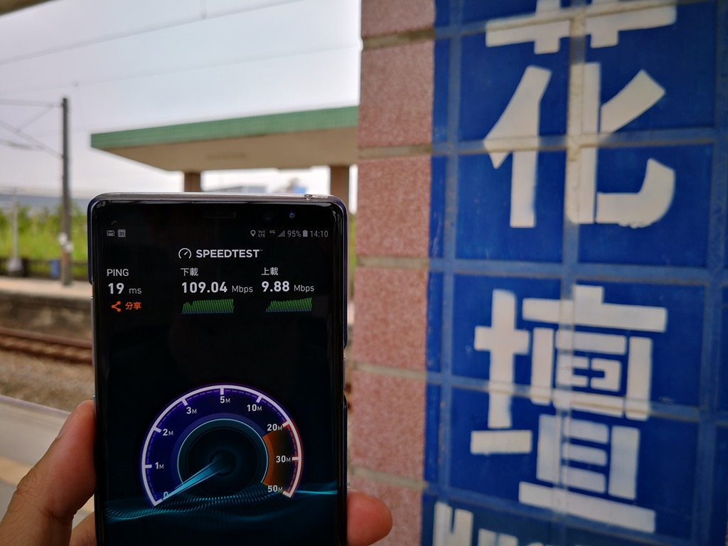 測速時除了車站隨機地點測試外,還包含在列車上測試,所得到的結果都非常好,以車站來說,較低的為苑裡車站售票大廳,測得 52.75Mbps 下載速度,但隨即在站外測得 97.25Mbps 的高速;在列車行進間,也都測得 40Mbps 以上的速度,最高還測到 63.12Mbps 的速度。