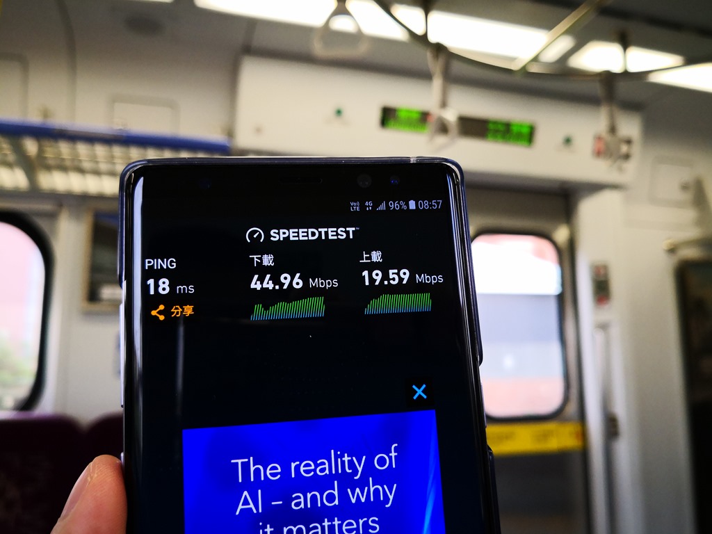 測速點 列車上 下載 44.96Mbps、上傳 19.59Mbps