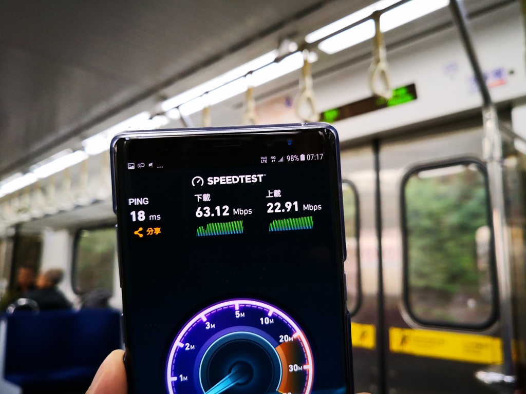 測速點 列車上 下載 63.12Mbps、上傳 22.91Mbps