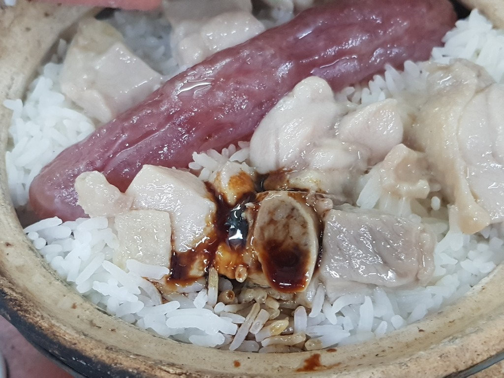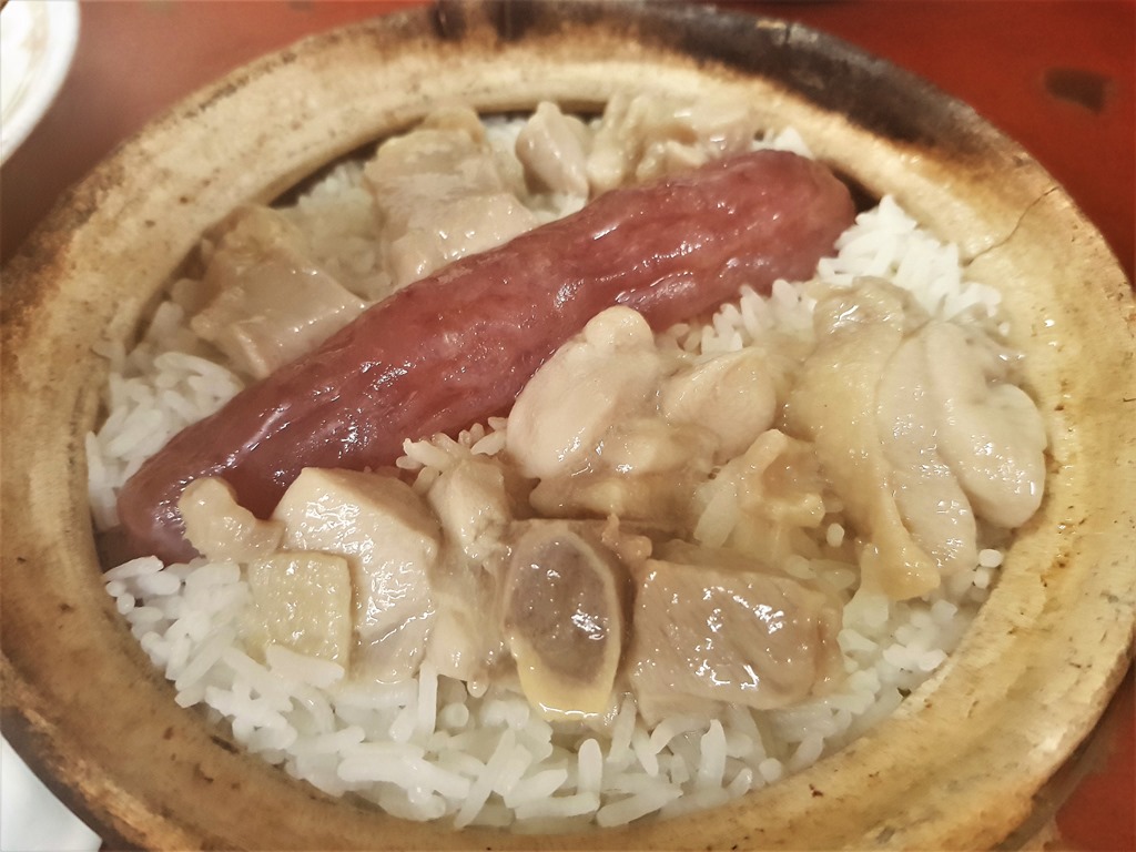 重頭戲來了,各位觀眾,臘腸滑雞煲仔飯!送上來時是沒有調味的,所以看起來白白一片,但香氣已經非常讓人流口水。