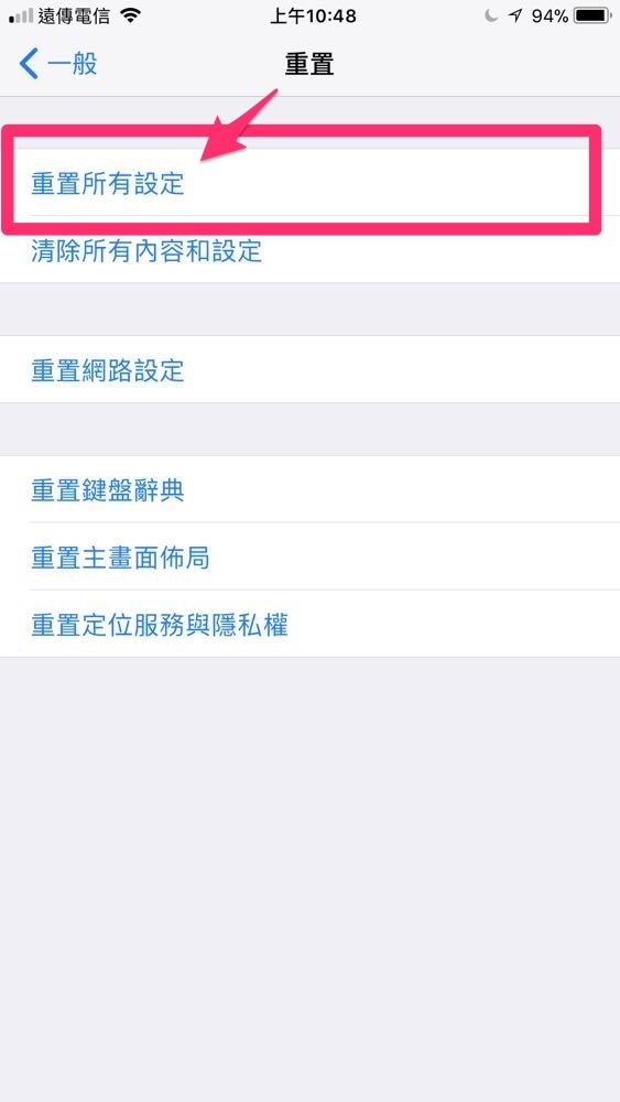 「設定」>>> 「一般」>>> 「重置」>>> 「重置所有設定」