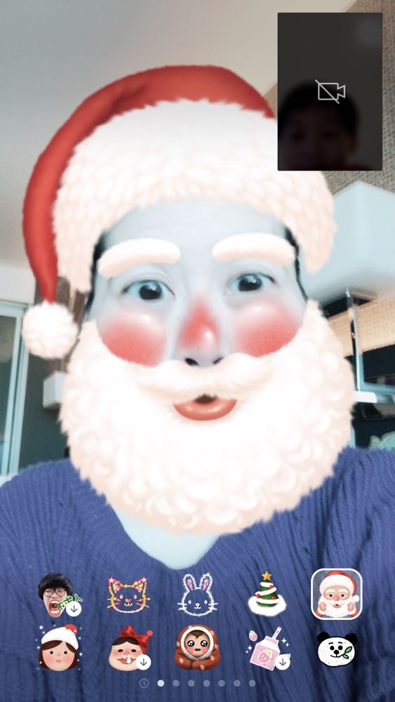 LINE 這三款濾鏡就在視訊通話時的下方,共有聖誕樹、聖誕老公公與「看起來」很可愛的聖誕帽造型。其中聖誕樹就是讓我們頭上戴著聖誕樹裝飾、聖誕老公公則是化身成為慈祥和藹的聖誕老公公。