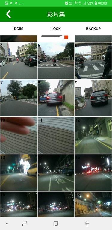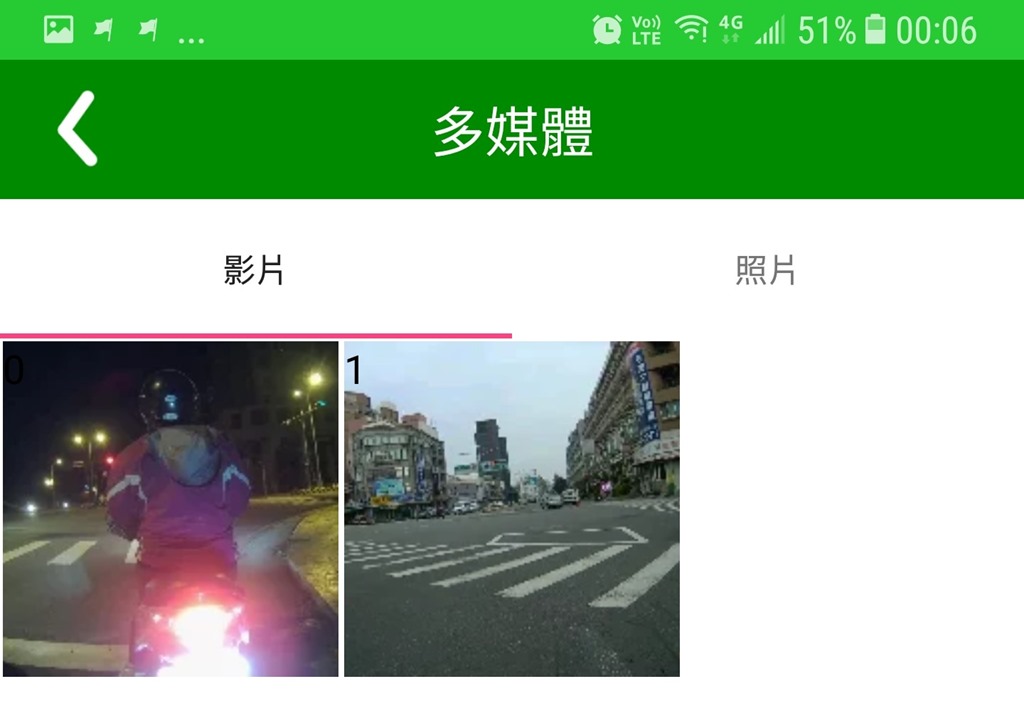 APP 主畫面中可觀看即時影像、我的影片集、影片集與照片集,即時影像就是目前記錄器所拍攝到的景象,可以方便調整紀錄器角度,影片集與照片及自然就是所拍攝下來的影片與照片。影片集中還有 LOCK 區,這邊就是讓你容易找到你所鎖定的影片,鎖定方式前面有提到,在拍攝過程中直接按下第二個鍵兩秒,就會鎖定檔案不會被刪除。
