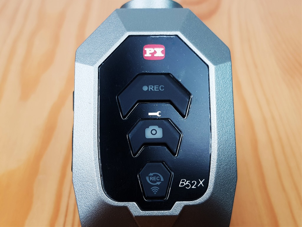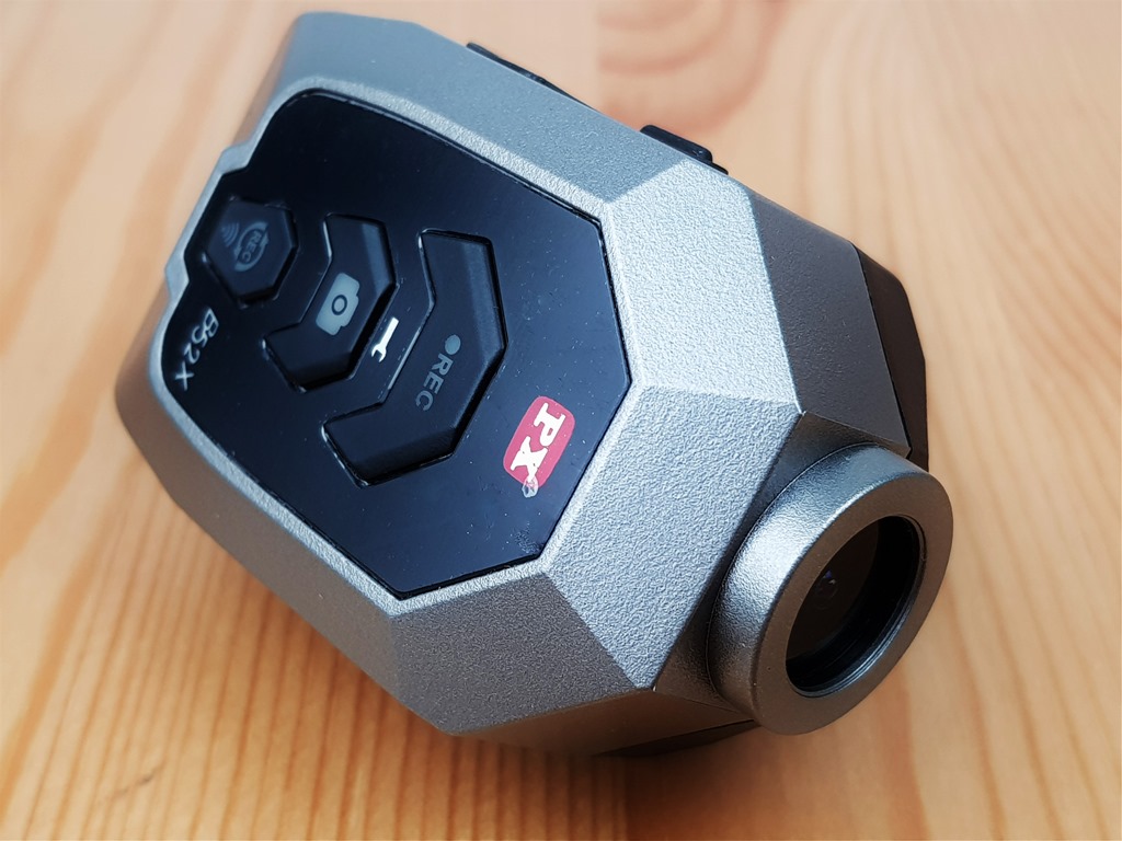 機身上配置三組多功按鈕,最上方 REC 按鈕顧名思義就是錄影鍵,在電源開啟下,一鍵就可開啟或關閉錄影,如果長按則可開啟或關閉電源;第二個按鍵為相機圖示,無論是不是在錄影期間,只要電源開啟狀況下,按下這按鍵就可以拍攝照片,另外在錄影期間,只要按下這按鈕兩秒,就可以鎖定當下正在錄製的影片,就算啟動循環錄影都不會讓鎖定的照片被清除;第三個按鍵可啟動循環錄影,作為行車紀錄器確保行車安全時建議使用這功能,可依據設定時間一段一段記錄下來,如果想要紀錄極限運動的厲害場面,建議就不要啟動循環錄影,這樣才能一支影片記錄到底。第三個按鍵還有個很重要的功能就是與智慧型手機連結,智慧型手機上的 PX GoBike APP 可以與 B52X 連接,除了可觀看即時影像與功能設定外,還能將影片照片傳到手機中並分享。