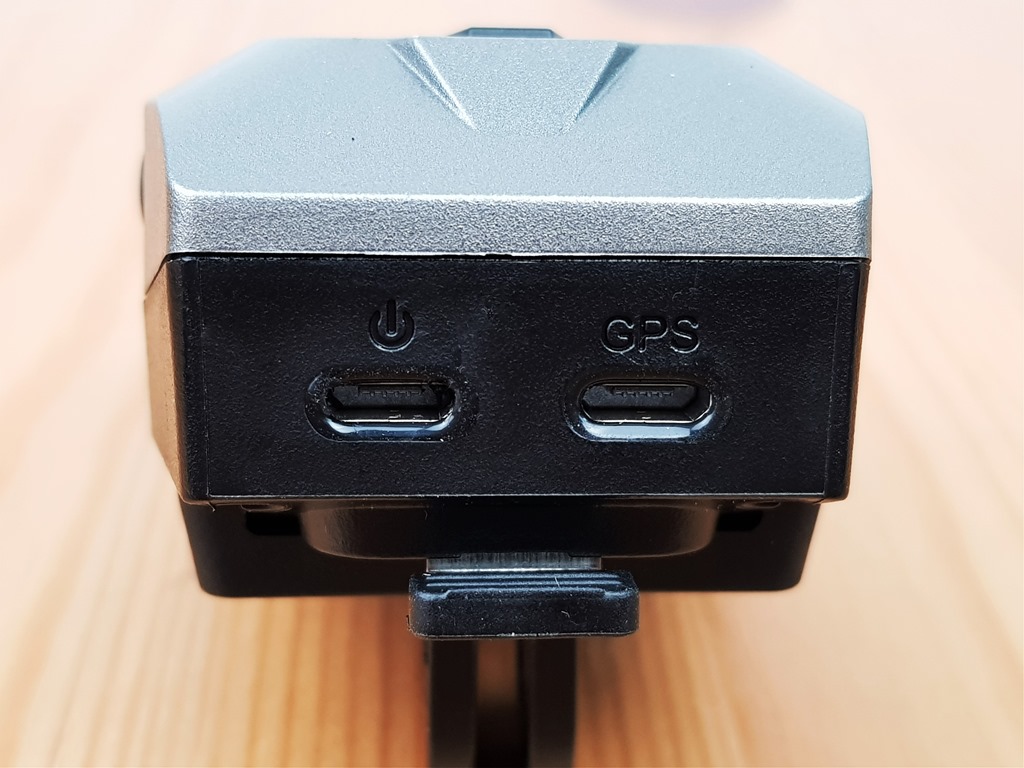 機身背後就是充電孔,雖然他是橢圓的看起來像 USB Type C,但事實上他是 micro USB,充飽一次大約可使用兩小時,如果你車上本身就具有 USB 供電孔,直接插上 USB 就可以讓紀錄器持續使用。另外一個孔位為 GPS,可插上外接 GPS 天線來增強收訊,記錄每段影片拍攝的地理資訊。